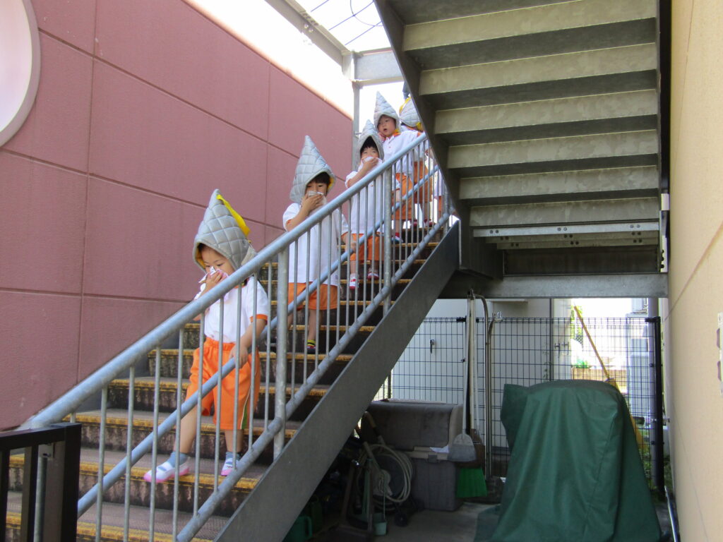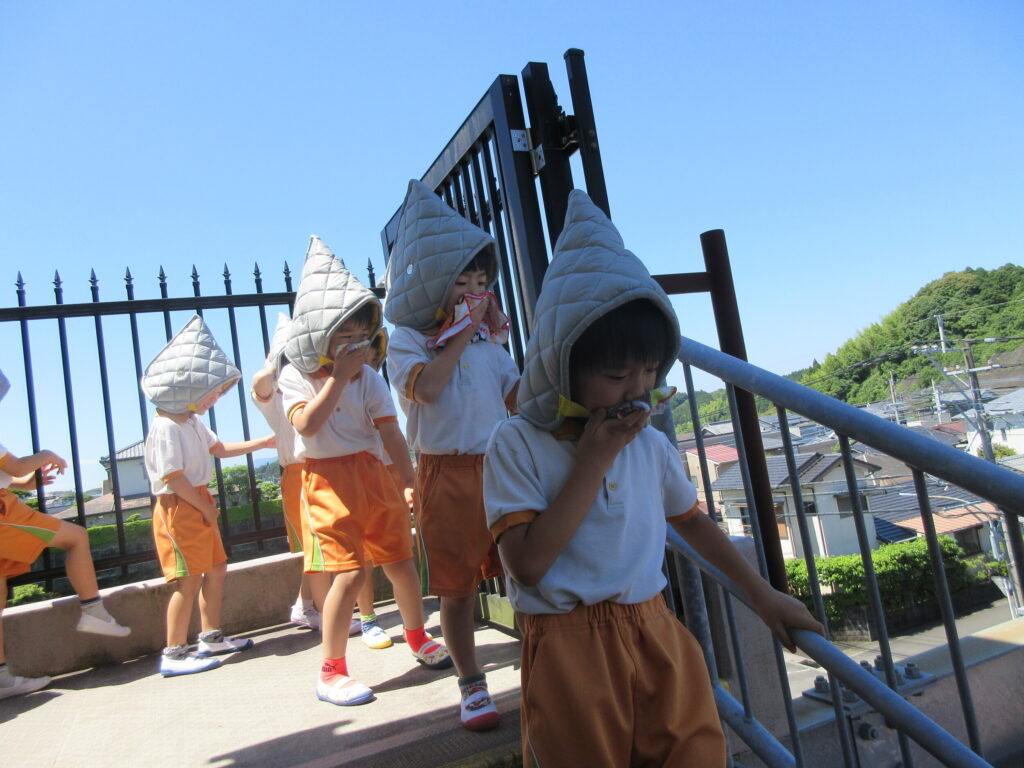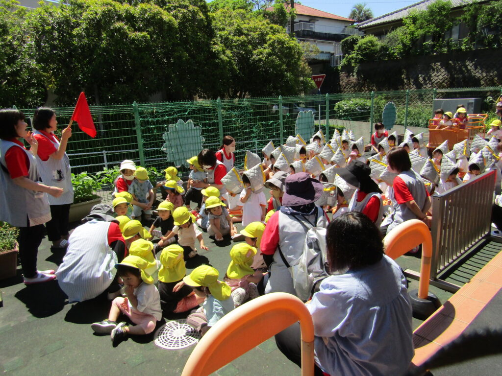 園にて、給食室より火災を想定した自主防災訓練を行いました。